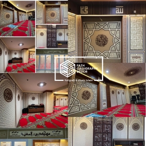 Pekerjaan arsitektur – interior- eksterior masjid (redesain/revitalisasi ) meliputi desain kaligrafi dan ornamen Islami untuk satu Masjid Baitul Mughni Kantor Pusat Mandiri Taspen Jakarta yang berlokasi di Jl. Proklamasi No.31 , Menteng Jakarta Pusat. Pekerjaan dikerjakan kurang lebih selama 21 hari pada bulan April 2023, meliputi kaligrafi full dinding masjid dan mihrab dengan bahan acrylic timbul dua layer , plafon masjid ,pintu kaca masjid berbahan snablast , pilar eksterior dan signage masjid berbahan acrylic timbul . Luas bidang pekerjaan masjid 5 m x 8m.