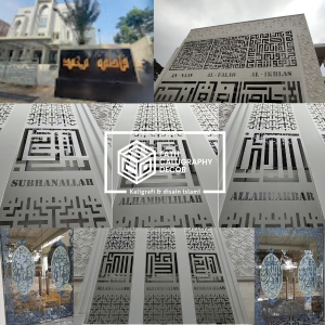 Desain Kaligrafi untuk Fasad, Kaca Masjid dan Logo Masjid Fatimah Muhammad Tebet Jakarta Jakarta yang berlokasi di Jl. Tebet Barat Raya No.44, Tebet Barat Jakarta Selatan. Desain Fasad Kiri khat kufic Surah Al Mu’awwidzatain (Surah Al Ikhlas , Surah Al Falaq dan Surah An Nas) untuk ukuran Fasad 10 m x 7 m , Desain Fasad Kanan khat kufic Kalimah Dzikir Utama tasbih, tahmid dan takbir untuk ukuran fasad 9.12 m x 7.6 m. Desain Kaca Inlay untuk jendela dan pintu kaca masjid dengan lafadz tahlil , takbir, hauqolah. Desain usulan lainnya adalah desain logo, desain nama masjid.